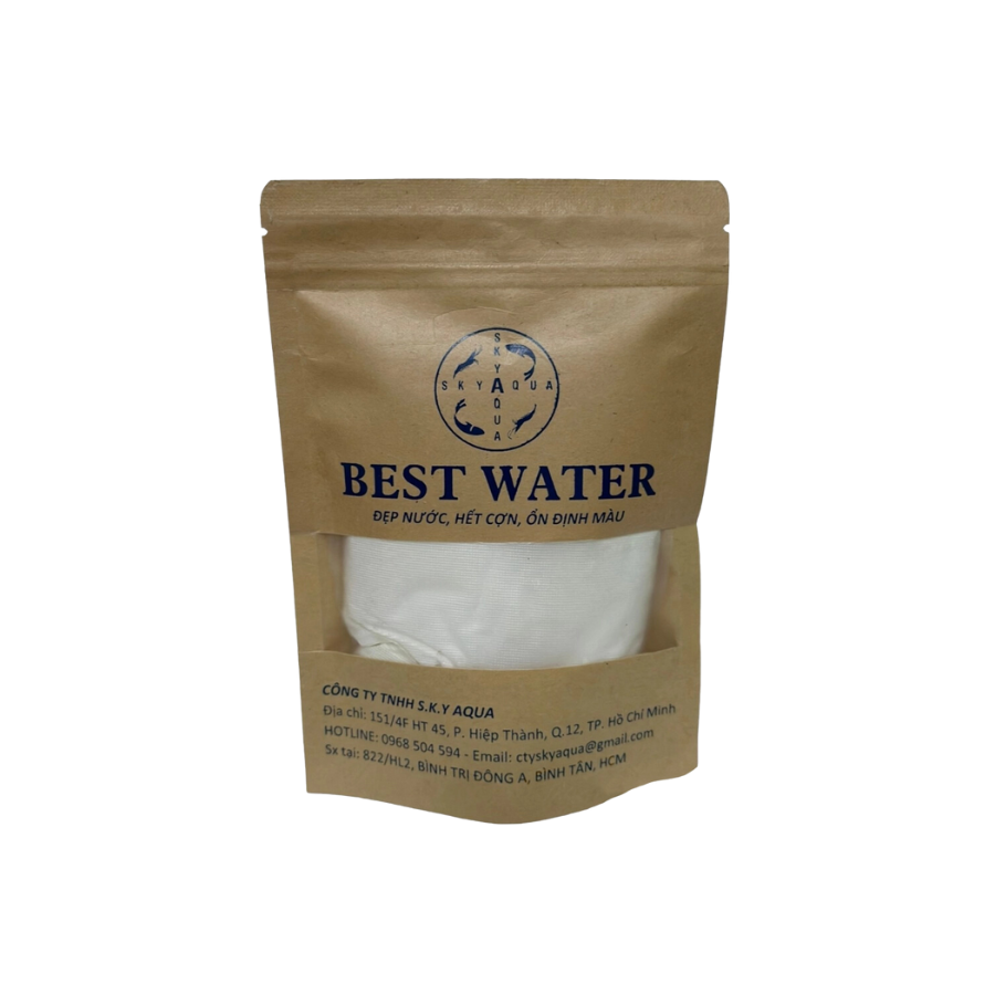 - Nguyên liệu ngoại nhập, sản phẩm dạng túi tự tan. Cung cấp các chủng loại vi sinh đậm đặc, phát triển tối ưu ở pH (7,5 – 8,0). BEST WATER còn có sự phối hợp của các Enzyme được sản xuất trong điều kiện đồng nhất về pH, chuyên biệt và đặc hiệu giúp quá trình làm sạch môi trường ao nuôi nhanh chóng, đẹp và ổn định màu nước, hạn chế tối đa quá trình sinh khí độ NH3 , NO2 trong suốt vụ nuôi.
