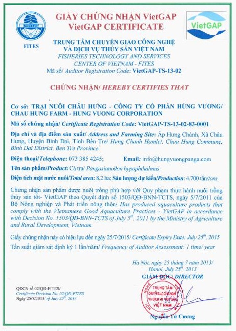 Năm 2013, Công ty Hùng Vương đã áp dụng và đăng ký chứng nhận VietGAP cho Trại nuôi Châu Hưng và Trung tâm Chuyển giao công nghệ và Dịch vụ thủy sản Việt Nam là đơn vị trực tiếp thực hiện việc đánh giá, chứng nhận.