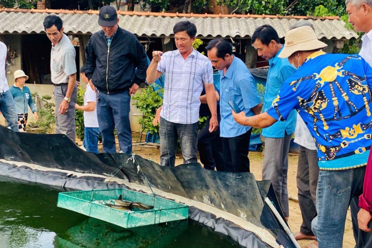 Bên cạnh đó, lớp tập huấn còn tổ chức cho bà con tham quan thực tế mô hình nuôi cá chình thương phẩm trong bể xi măng tại thôn Châu Trúc (xã Phù Mỹ Bắc) và thôn 7 Bắc (xã Phù Mỹ Đông). Tại đây, các hộ nông dân được tận mắt quan sát hệ thống bể nuôi, cách bố trí ao lắng, ao xử lý nước, quy trình cho ăn, quản lý môi trường nước,…. Qua đó, người dân có cơ hội trao đổi, học hỏi trực tiếp kinh nghiệm thực tế từ các hộ nuôi đi trước, từ đó rút ra bài học để áp dụng vào mô hình của gia đình mình.