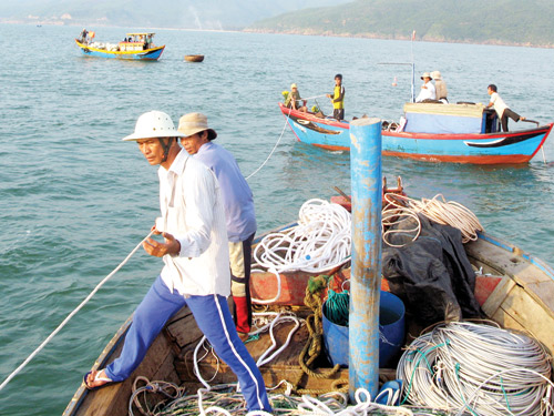 Đoàn công tác thả dàn lưới câu phòng tránh cá mập tại biển Quy Nhơn - Ảnh: Trần Minh