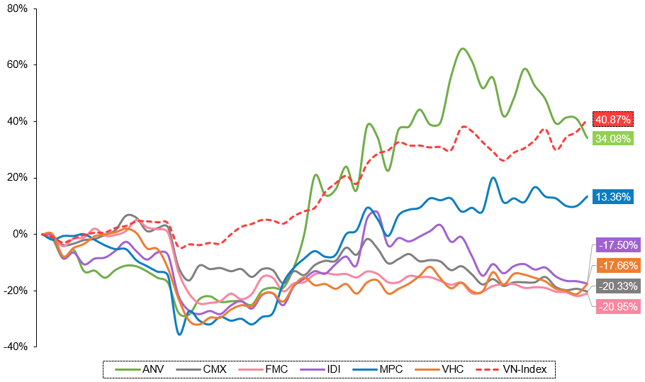 Mặc dù kim ngạch xuất khẩu thủy sản năm 2025 đạt mức kỷ lục, diễn biến của nhóm cổ phiếu thủy sản lại không phản ánh sự hưng phấn tương ứng. Phần lớn cổ phiếu trong ngành ghi nhận hiệu suất âm và kém hơn VN-Index, ngoại trừ một số trường hợp cá biệt như ANV. Sự lệch pha giữa tăng trưởng xuất khẩu và diễn biến giá cổ phiếu cho thấy thị trường đã thay đổi cách tiếp cận trong định giá doanh nghiệp.