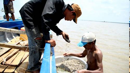 Khai thác sò giống tại đầu vàm Xẻo Quau, huyện An Biên - Ảnh: Tấn Đức