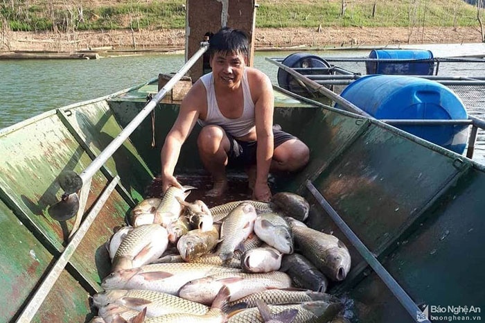 Đến nay, gia đình anh đã có 20 lồng, được kết nối với nhau một cách hợp lý, khoảng cách giữa các phao, bè phù hợp và khoa học, giúp tránh nguy cơ lây lan dịch bệnh. Hiện nay, với 20 lồng cá trắm và cá leo, mỗi năm gia đình anh Sáng thu hoạch được hàng chục tấn cá. Sau khi thu hoạch, cá được các nhà hàng ở TP.Vinh, TX.Thái Hòa… lên tận nơi thu mua.