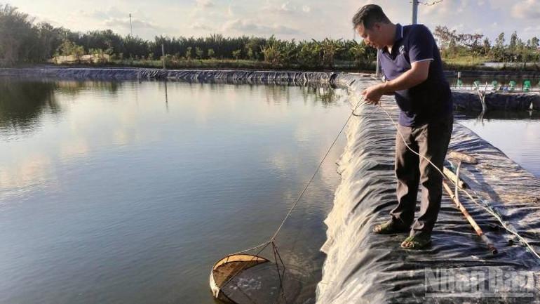 Ông Xoàn chuyển giao kỹ thuật nuôi cua lột cho nông dân chung quanh.