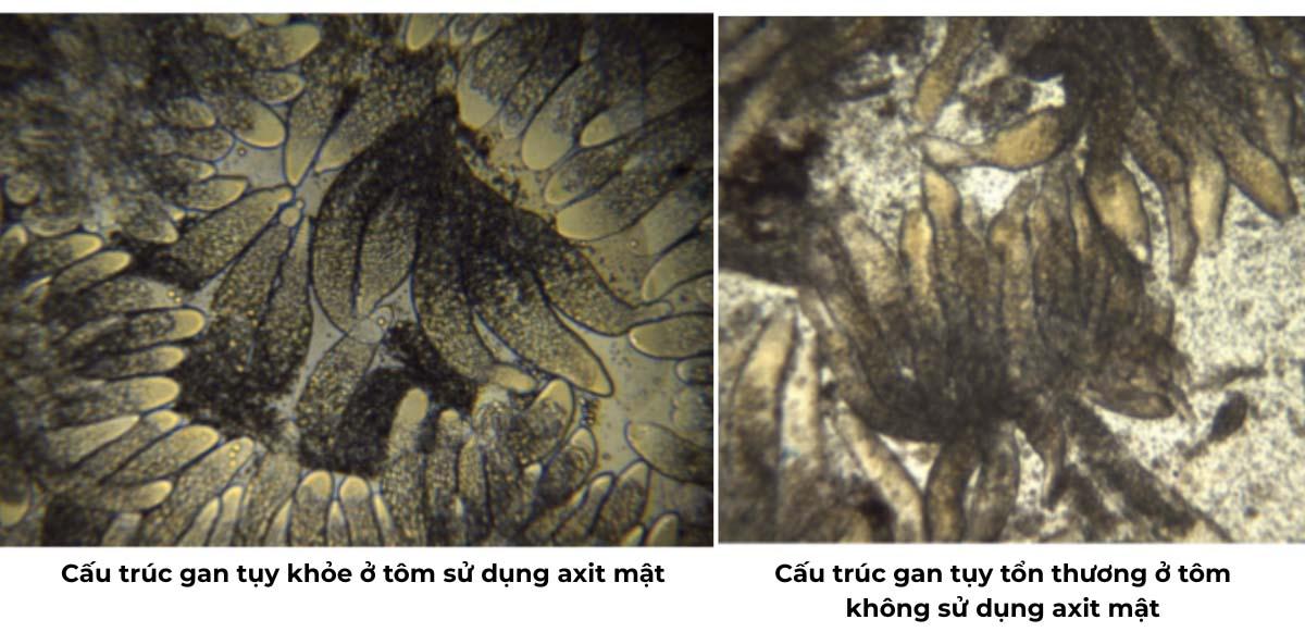 Ở tôm, cholesterol là sterol chủ yếu trong nhóm lipid - thành phần sinh hóa lớn thứ hai sau protein - hiện diện trong mọi tế bào và huyết dịch. Tuy nhiên, tôm và các loài giáp xác không thể tự tổng hợp cholesterol và axit mật. Trong khi đó, cholesterol lại là tiền chất của hormone lột xác, quyết định quá trình lột xác nhanh chóng của tôm qua từng giai đoạn phát triển. Cùng với đó, gan tụy giữ vai trò trung tâm trong tiêu hóa và miễn dịch. Do vậy, bổ sung axit mật sẽ giúp giảm gánh nặng, ổn định chức năng gan tụy và hỗ trợ tăng trưởng hiệu quả.