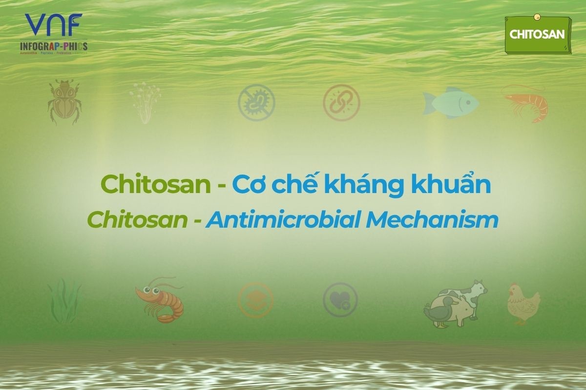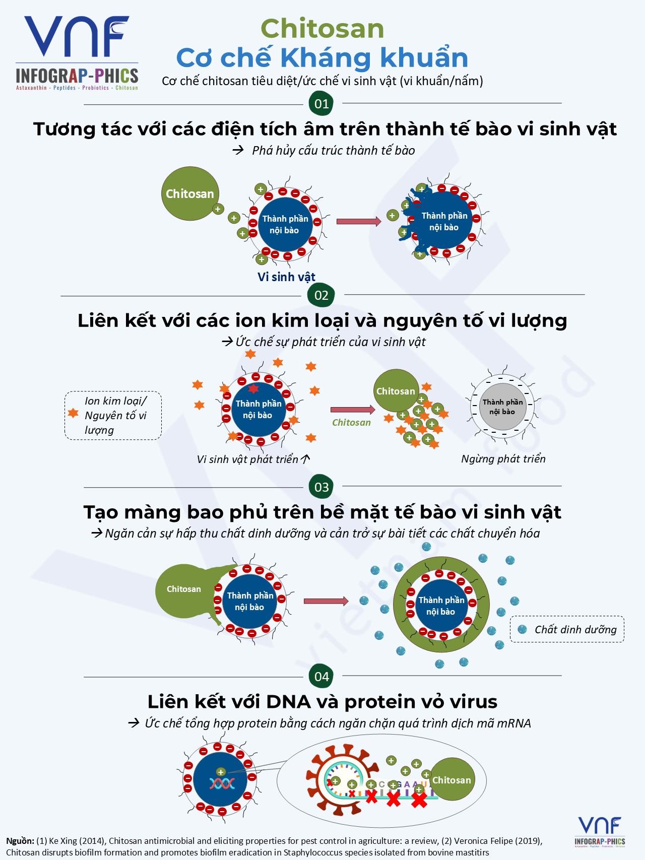 Hãy cùng khám phá infographic dưới đây để biết được cách chitosan tương tác với các điện tích âm, phá vỡ màng tế bào vi sinh vật và làm thay đổi môi trường sống của chúng, khiến chúng không thể phát triển.