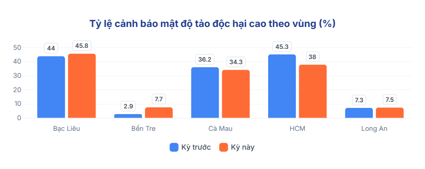 Xét theo từng vùng, sự cải thiện này thể hiện rõ rệt nhất tại Bạc Liêu (tỷ lệ ao cảnh báo giảm từ 41.6% xuống 35.5%) và HCM (giảm từ 46.6% xuống 43.2%). Các tỉnh Long An và Bến Tre cũng ghi nhận tình hình khả quan hơn.